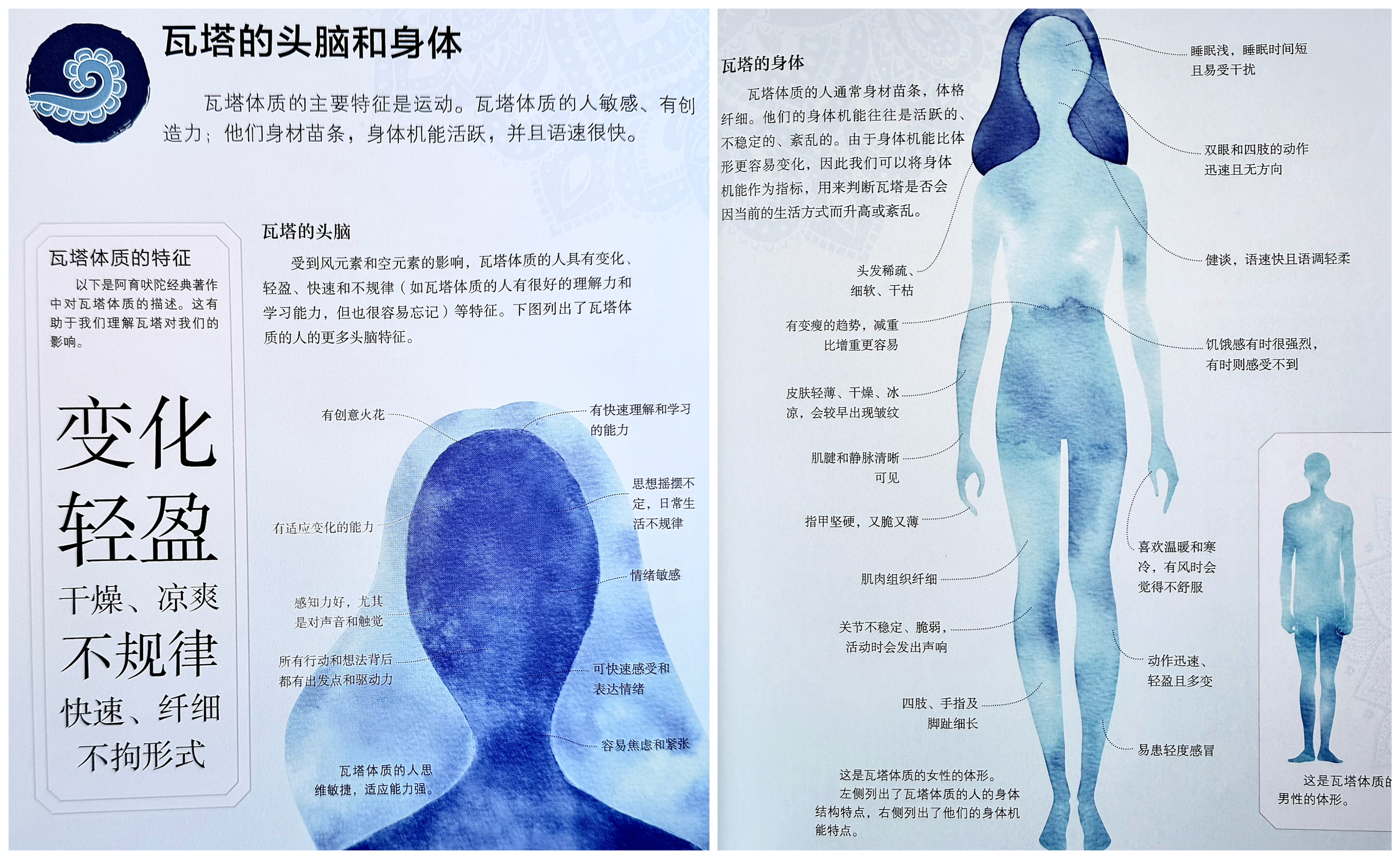 瓦塔(Vata): 掌管运动、循环、呼吸、神经冲动。特质是轻、动、冷、燥、细