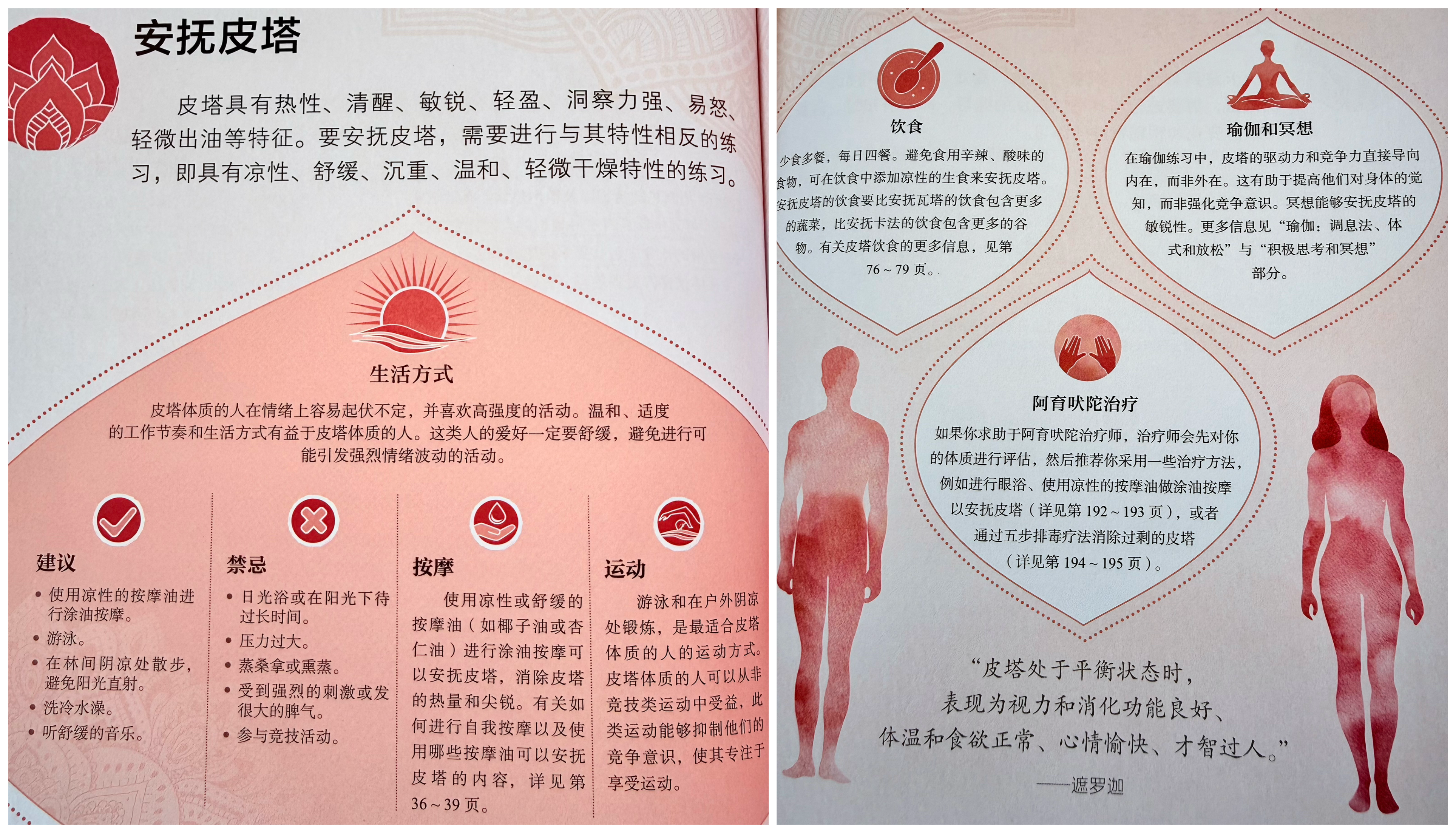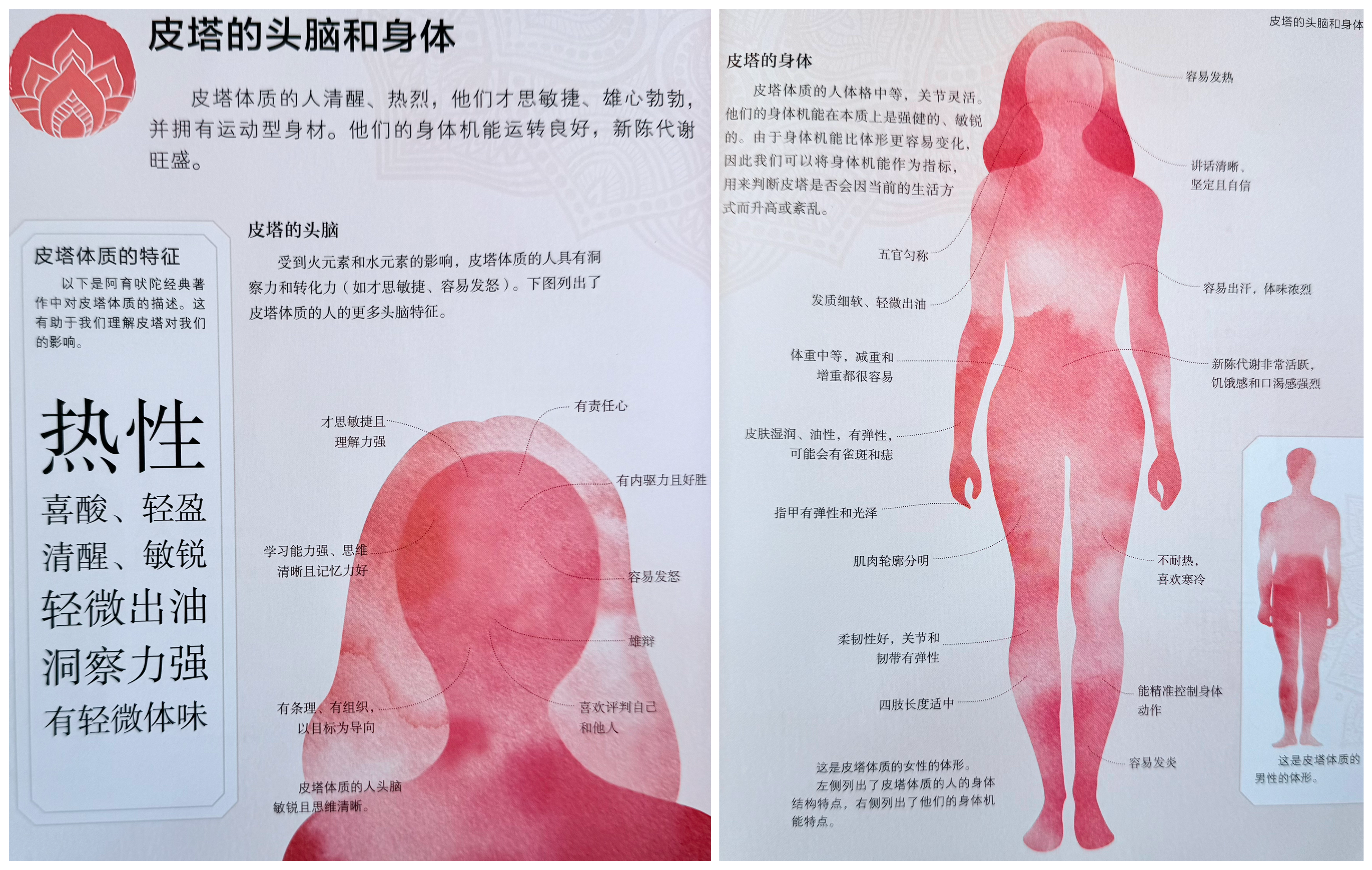 皮塔(Pitta): 掌管消化、代谢、转化、体温。特质是热、锐、轻、油、流动