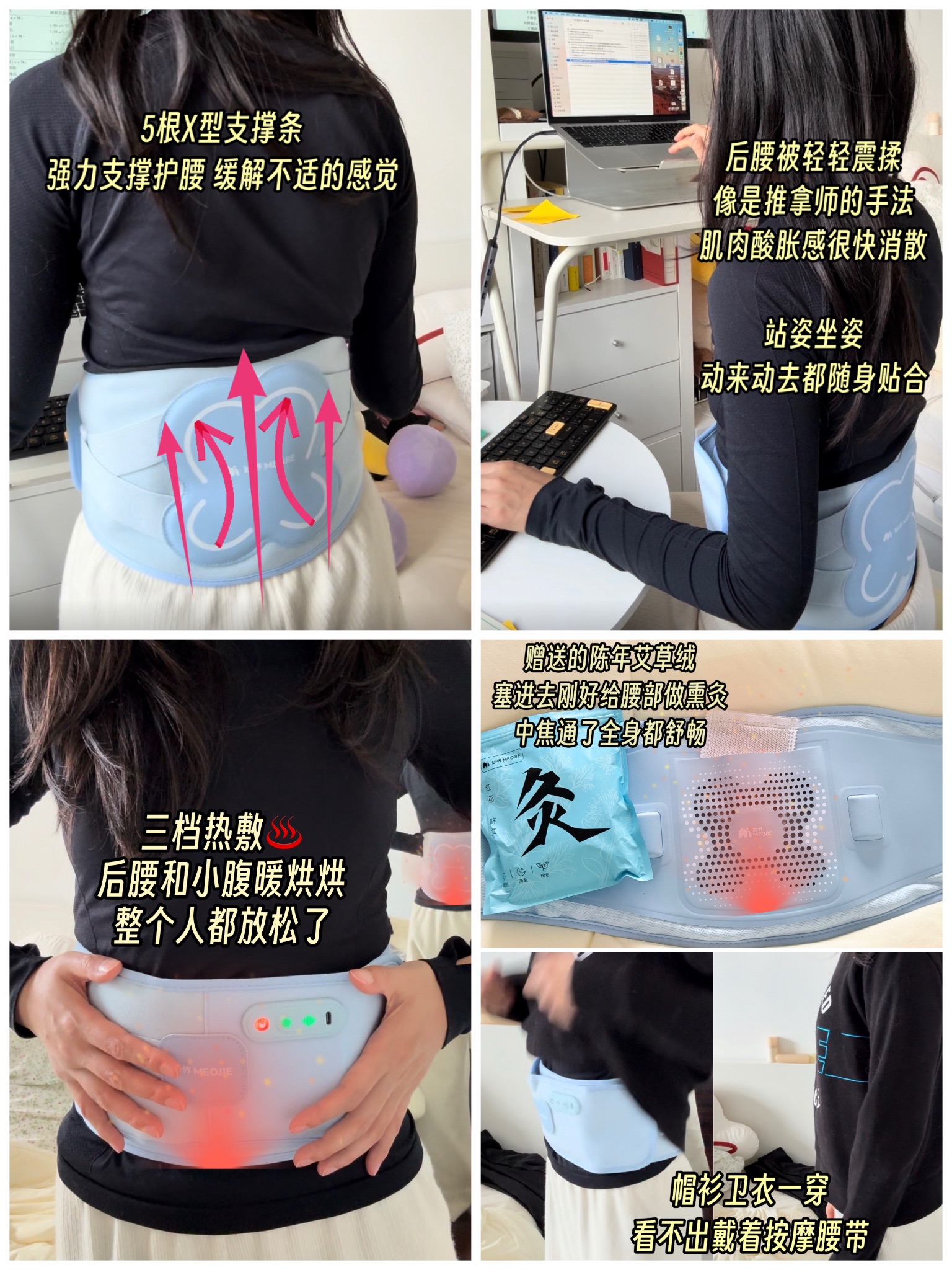 标:放松。热敷(包裹感):石墨烯5秒速热,超大发热面积(约4张暖宝宝大小)覆盖腰腹,带来环绕温感。可加入陈年艾草绒👍按摩(酥麻感):7300转/分钟高频微震,3档力度,老师傅指揉的感觉,酥麻揉散肌肉酸胀