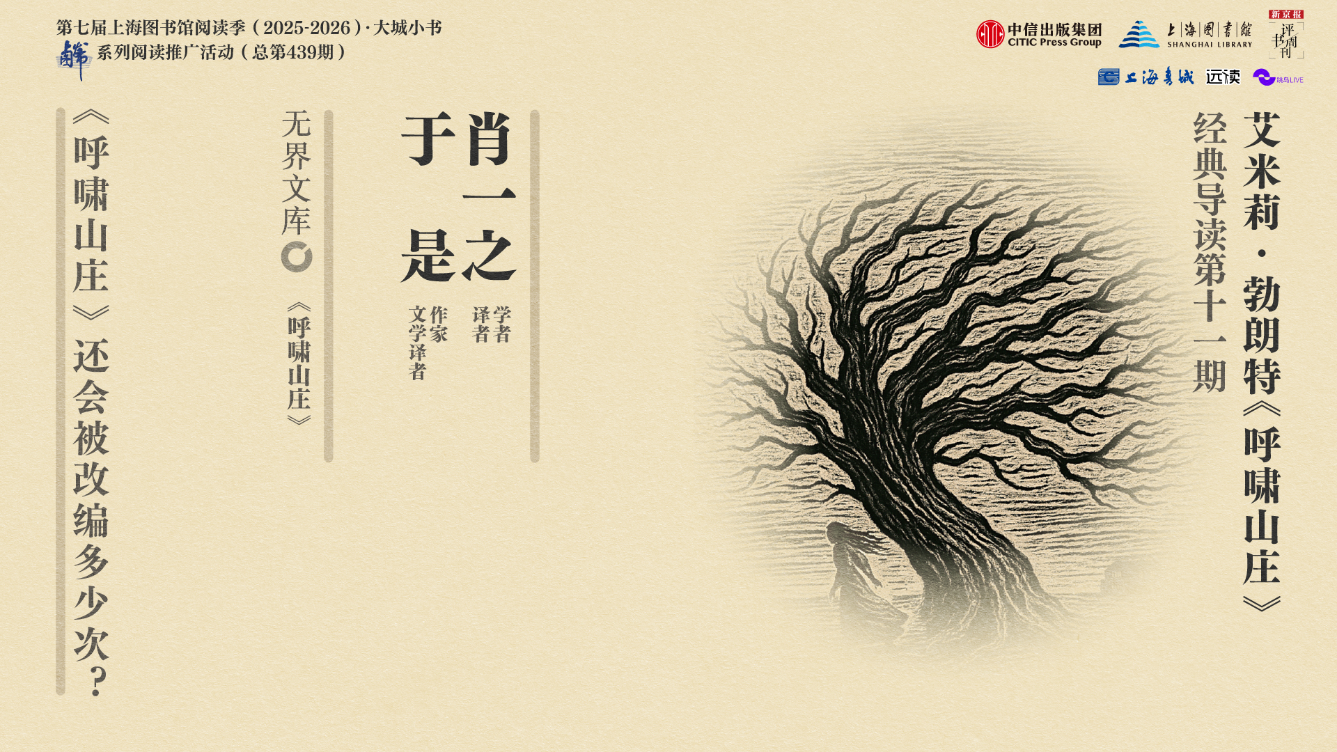 本期节目,文学学者、译者肖一之和作家、文学译者于是,将以“《呼啸山庄》还将被改编多少次?”为题,从《呼啸山庄》文本出发,导读这部在100年内被翻拍过20次的文学作品,为何具有如此魔力,以至于每隔一段时间就会被重新解读、演绎和呈现。