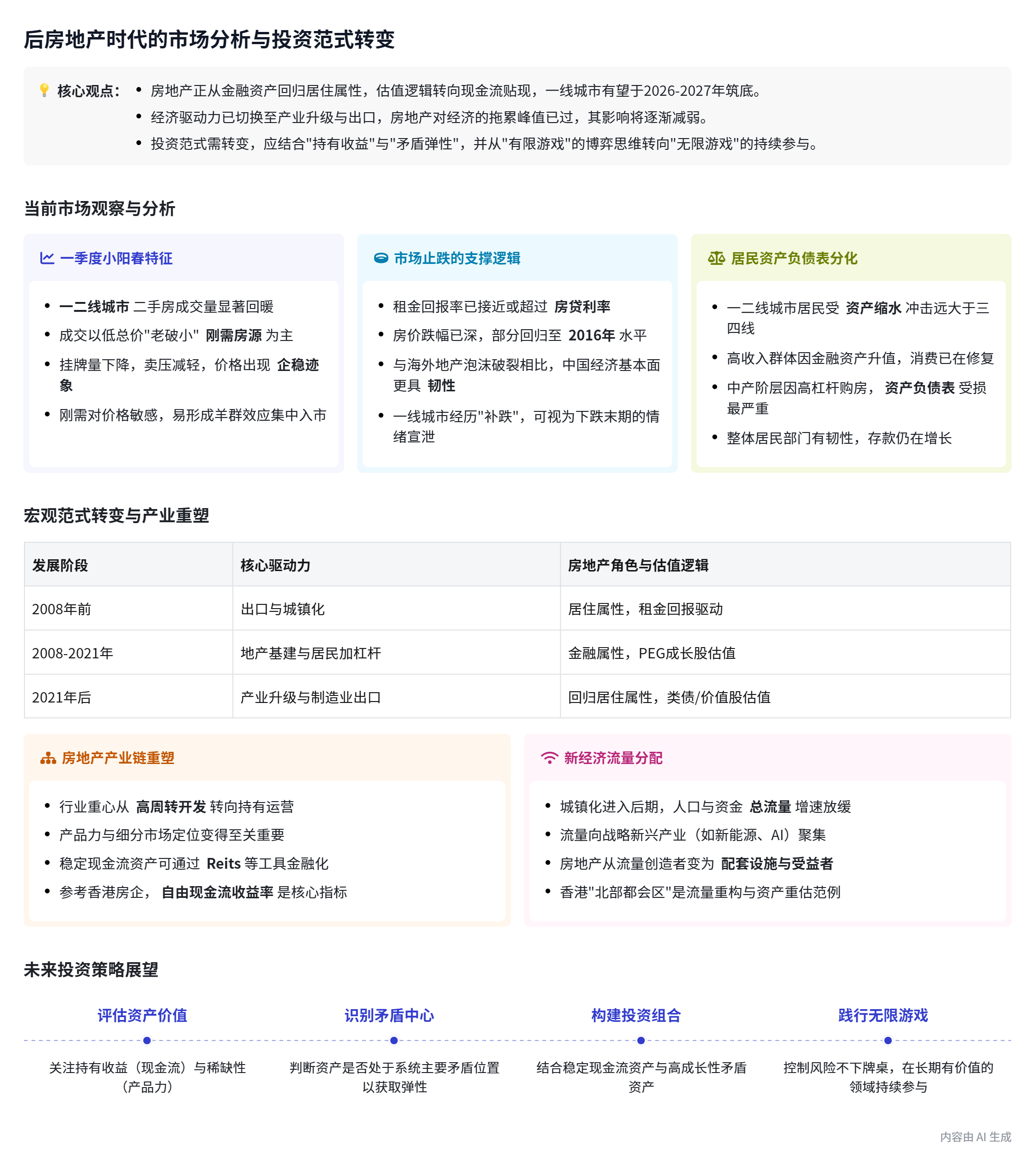 后房地产时代,行业从增长引擎变为价值重估资产,宏观循环从地产-金融驱动转向新兴产业驱动,产业链需适应现金流与产品力为核心的新模式。