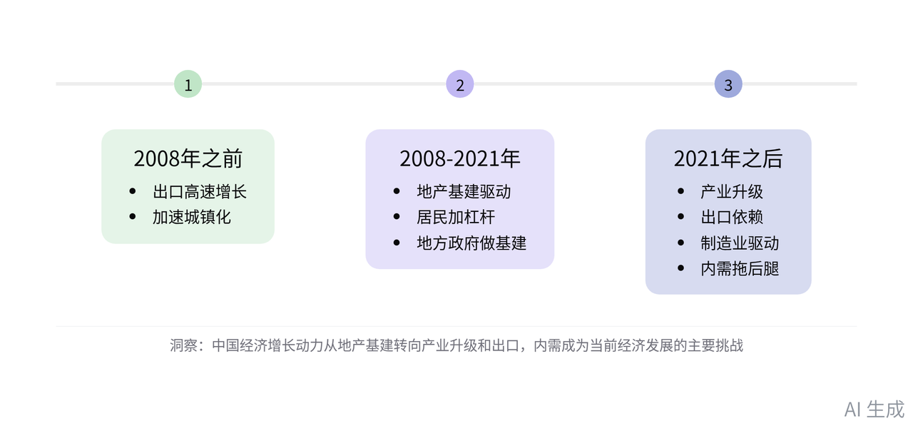 - 经济增长动力切换:2000 年后中国经济增长分为三个阶段:08 年之前靠出口和城镇化,08 - 21 年靠地产基建和居民加杠杆,21 年后依赖产业升级和出口。外需重要性正在提升,内需拖后腿。