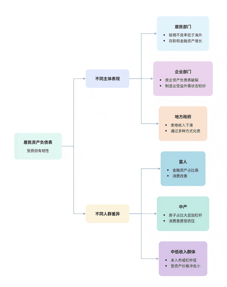 - 中产:房子占比大且加杠杆,过去几年状态差,消费意愿受挤压;