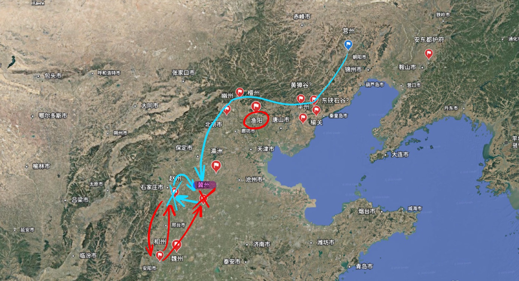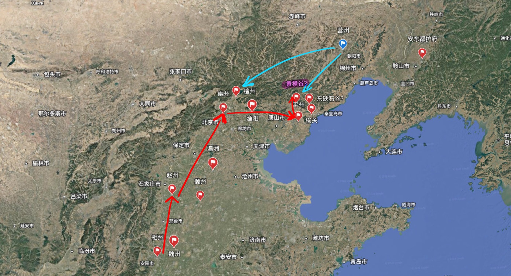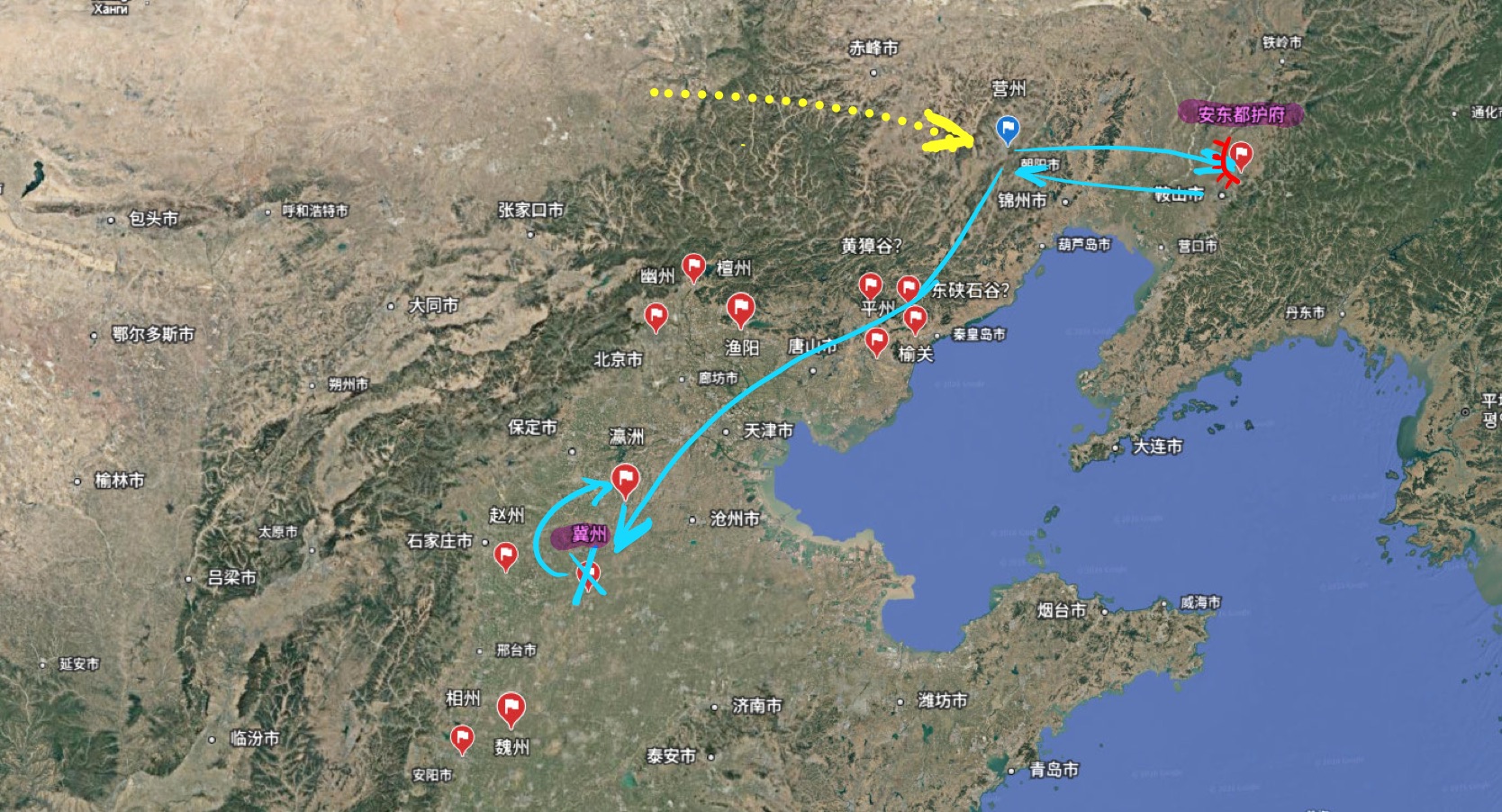 注释:红色为武周进军路线;蓝色为契丹进军路线;黄色为突厥进军路线。紫色荧光地点为武周、契丹交战地点。