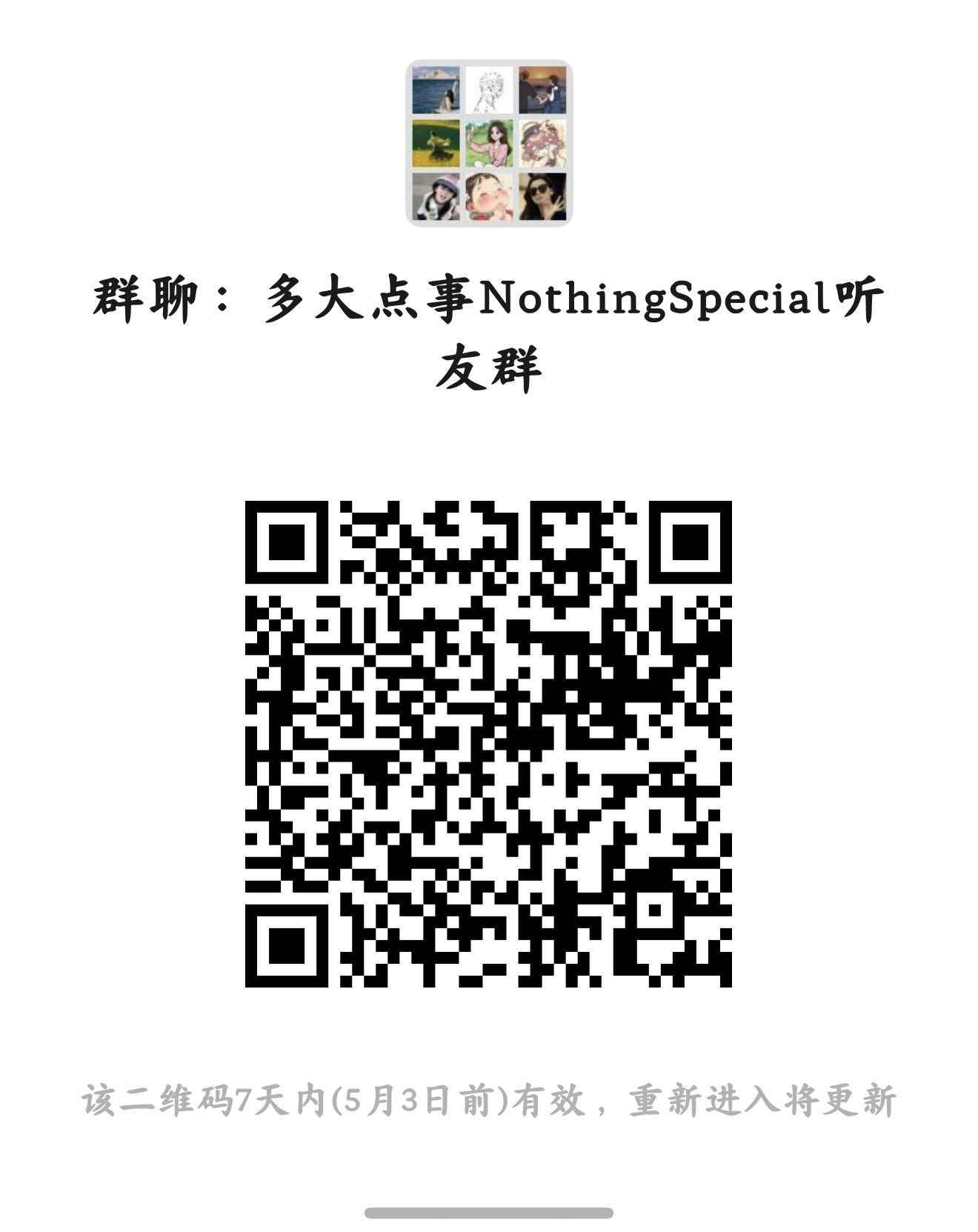 Hello 大家好,我们的栏目成立听友群啦!七七和小满一直以来都非常感谢大家对我们栏目的关注,也希望和听众朋友们建立联系,听听你们对节目的感受,有没有希望我们看到和分享的书籍和电影。希望大家可以扫描下方的二维码加入微信群,我们在这里期盼你的加入哦!如果有任何问题,也欢迎添加小满的私人微信:diana_tong_26