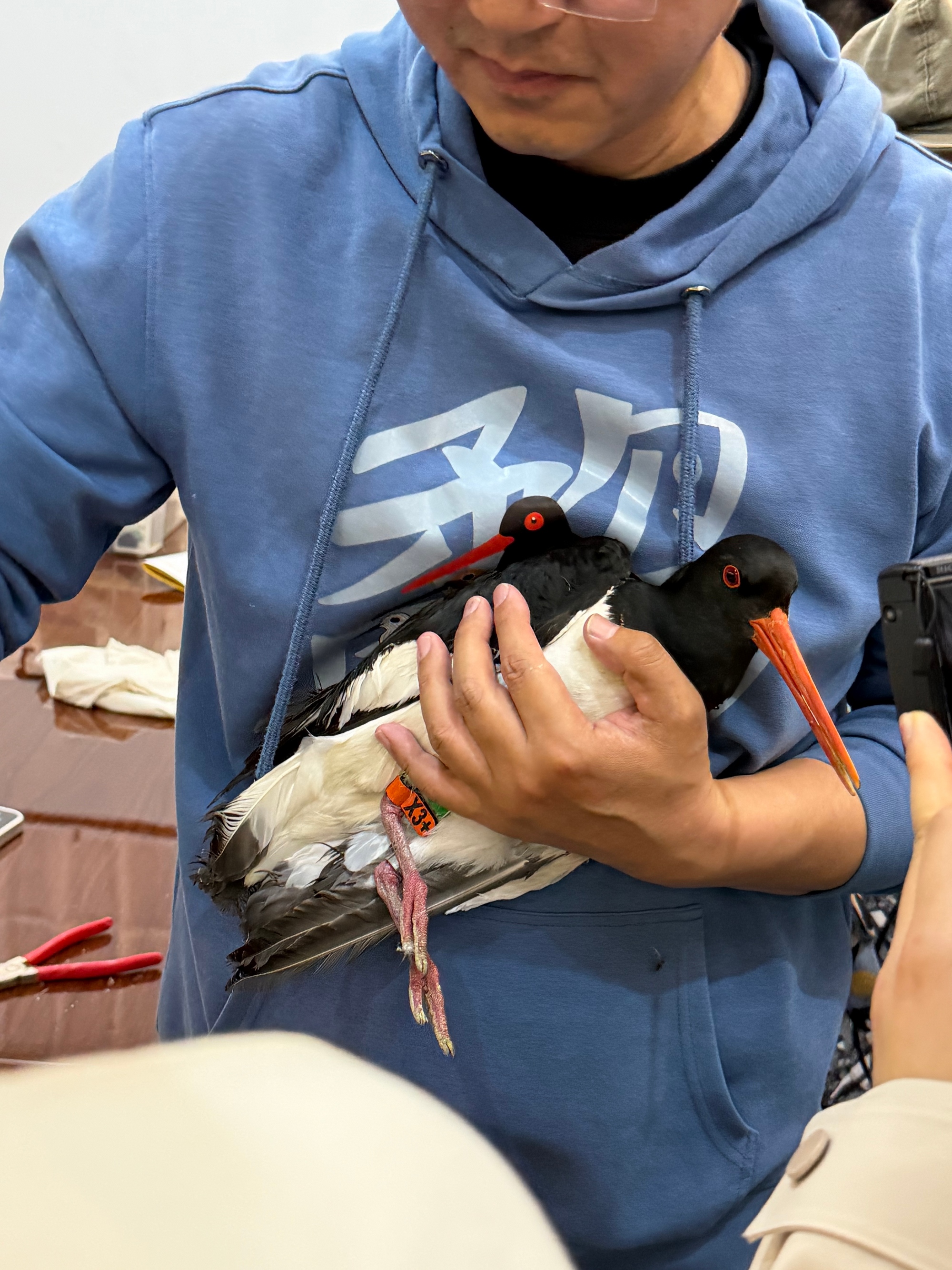 △ 白清泉老师与被环志的蛎鹬 Photo by 筱慧