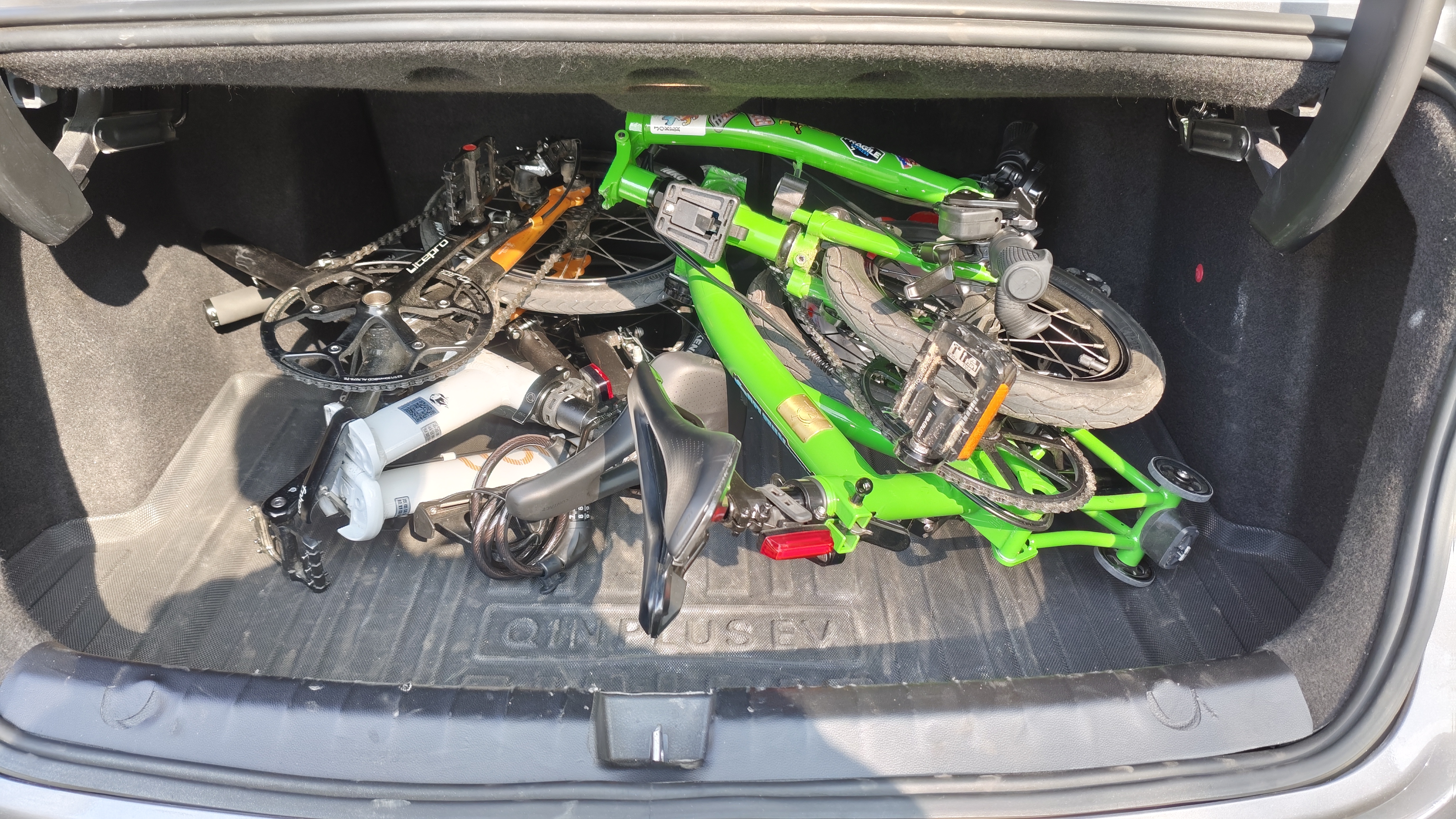 两辆折叠车折叠后刚好可以放进网约车后备箱