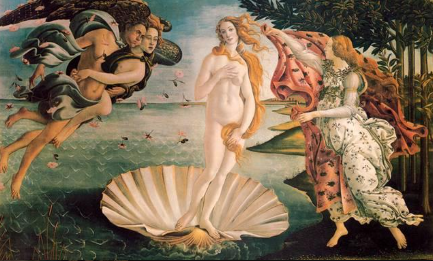 图片源自贡布里希《艺术的故事》,波提切利,维纳斯诞生,约1485年,画布蛋胶画,172.5x278.5cm,Uffizi, Florence
