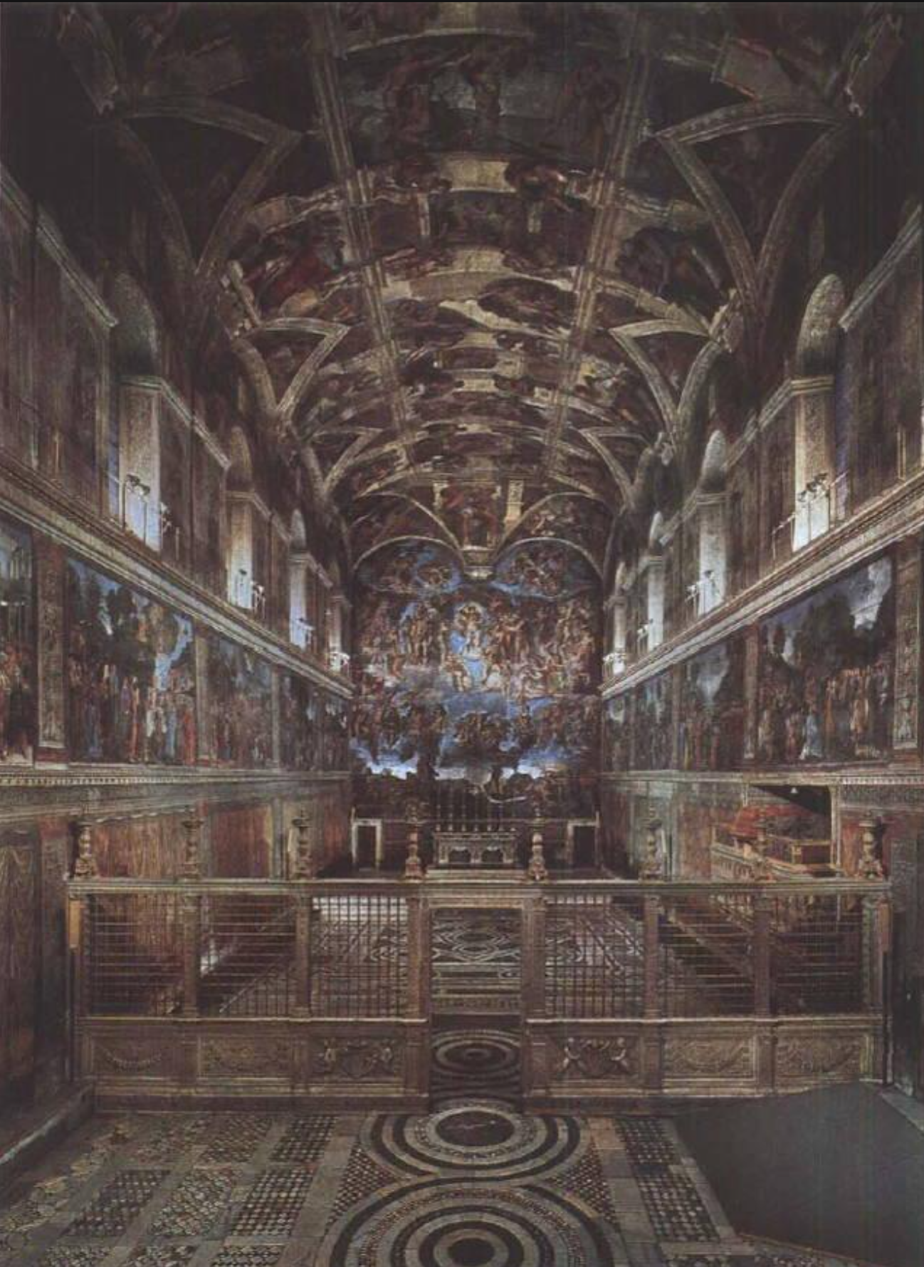 图片来自贡布里希《艺术的故事》,梵蒂冈的西斯廷礼拜堂,壁画清洗之前的内部概览