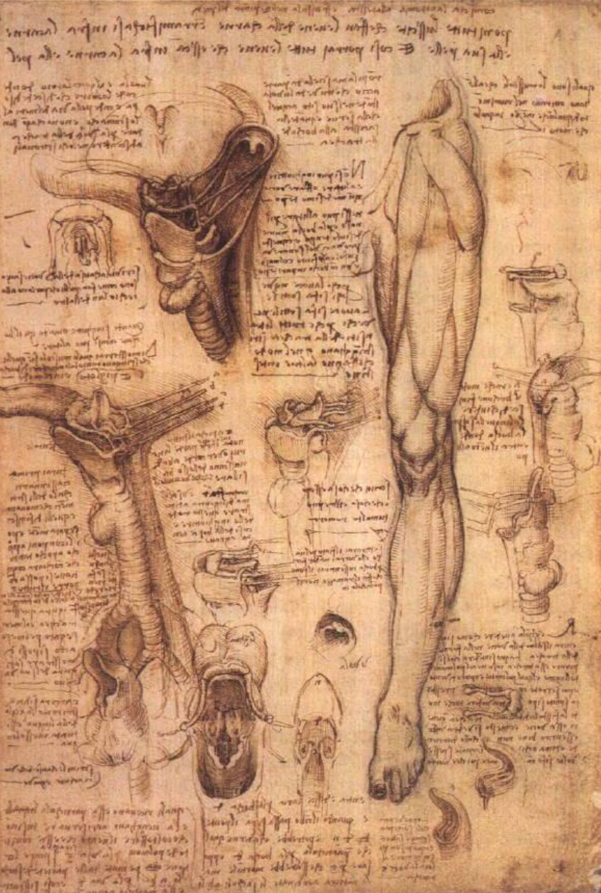 图片源自贡布里希《艺术的故事》,莱奥纳尔多·达·芬奇解剖研究(喉头和腿部),1510年,蘸水笔、褐色墨水、黑粉笔画于纸上,Royal Library, Windsor Castle
